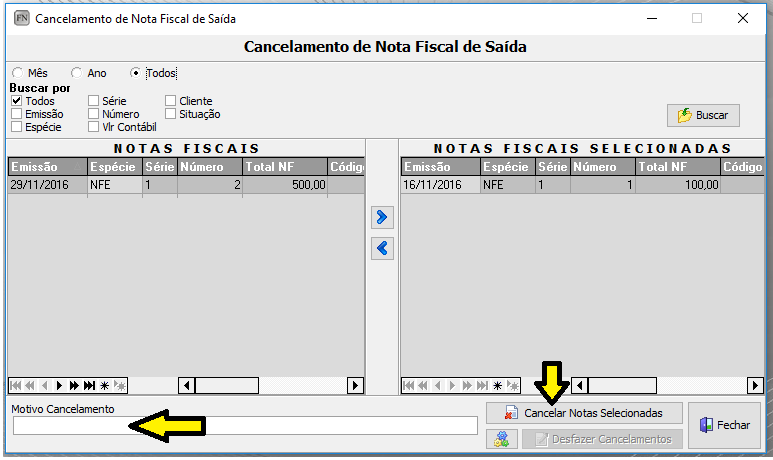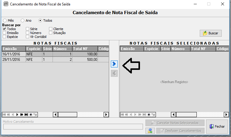 Selecionar a nota fiscal a ser cancelada na seta passando esta nota para o outro quadro: